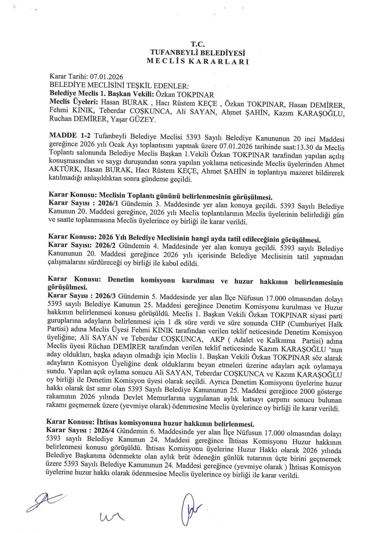 2026 Yılı ocak Ayı Meclis Karar Turanakları